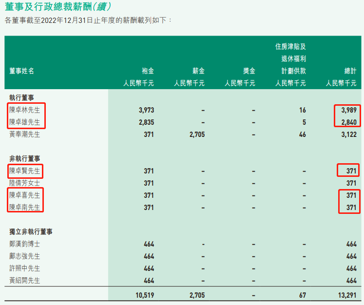 据猫崽了解,陈卓林去年的薪酬398.9万元,陈卓雄284万元,而已经被“边缘化”的陈卓贤和其他两位兄弟一样,领着37万的年薪。