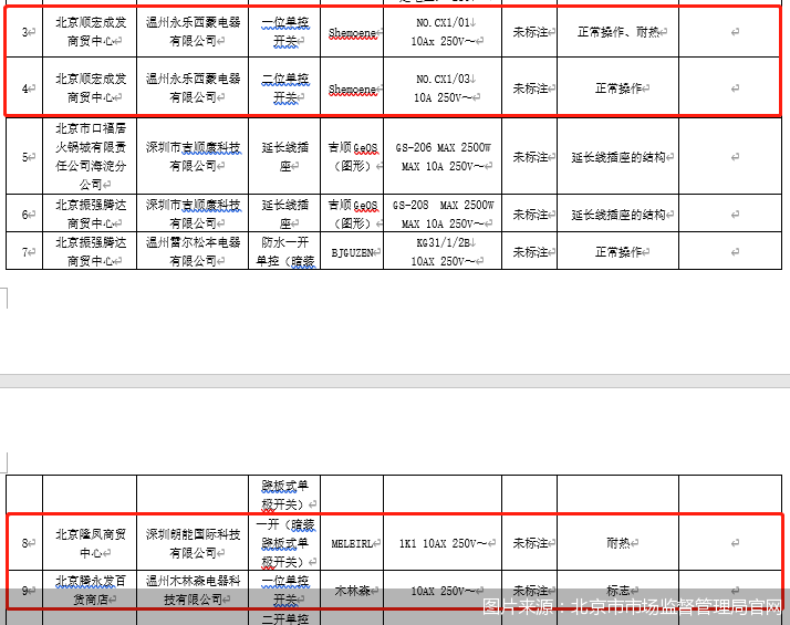 商标为“Shemoene”的“一位单控开关”和“二位单控开关”,被分别检出“正常操作、耐热”和“正常操作”项目不合格,规格型号分别为“NO.CX1/01 10Ax 250V~”和“NO.CX1/03 10A 250V~”,其标称生产者/生产者均为“温州永乐西蒙电器有限公司”、被抽样销售者均为“北京顺宏成发商贸中心”。