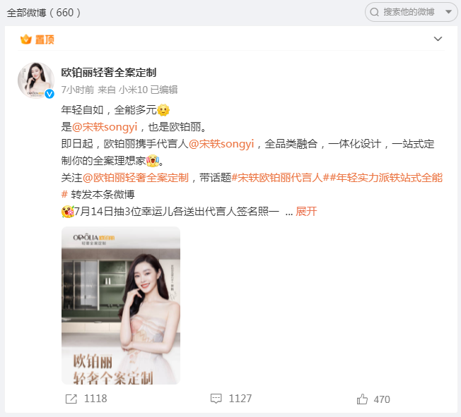 7月4日,欧派集团旗下轻奢时尚品牌欧铂丽正式官宣宋轶成为品牌代言人。即日起,欧铂丽携手代言人宋轶,全品类融合,一体化设计,一站式定制全案理想家。