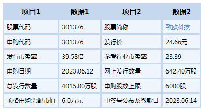 6月12日,致欧家居科技股份有限公司(简称“致欧科技”)开启申购,公司此次发行总数为4015万股,其中网上发行642万股,申购代码301376,申购价格24.66元,发行市盈率为39.58倍,单一账户申购上限为6000.00股,顶格申购需配市值6万元。