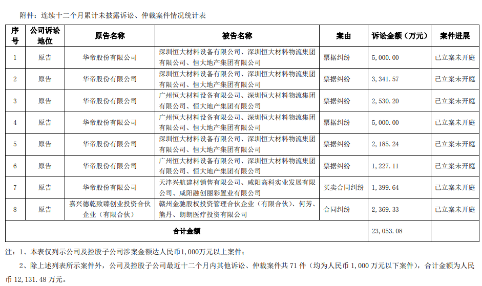 随公告发布的《连续十二个月累计未披露诉讼、仲裁案件情况统计表》显示,华帝股份及控股子公司涉案金额达1000万元以上的8起案件中,6起与恒大系公司有关,且案由均为票据纠纷,涉案金额合计约1.93亿元。其中,2起案件的诉讼金额为5000万元。