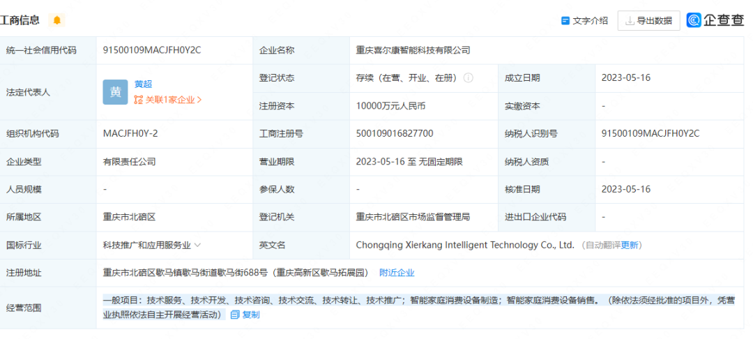 5月16日,喜尔康成立重庆喜尔康智能科技有限公司,注册资本1亿元,法定代表人为黄超,经营范围为技术服务、技术开发、技术咨询、技术交流、技术转让、技术推广;智能家庭消费设备制造;智能家庭消费设备销售等。经过股权穿透,该公司股东分别为极客慧谷(重庆)企业管理咨询有限公司、浙江喜尔康智能家居股份有限公司。